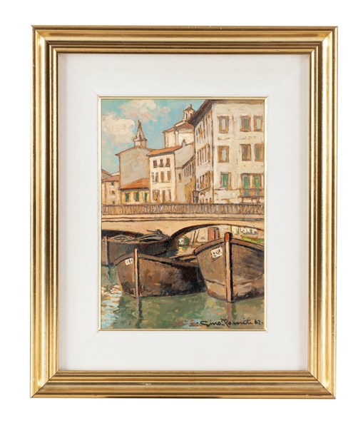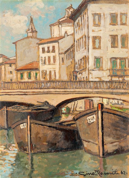 Gino Romiti "Il porto" '62 olio su compensato (cm 25x18) Firmato e datato in bas