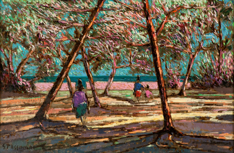 Gino Tassinari Pineta sul mare Olio su tela, cm. 40x60 Firmato in basso a sinistra. Sul verso: firma; Etichetta dell'Artista con descrizione e firma.