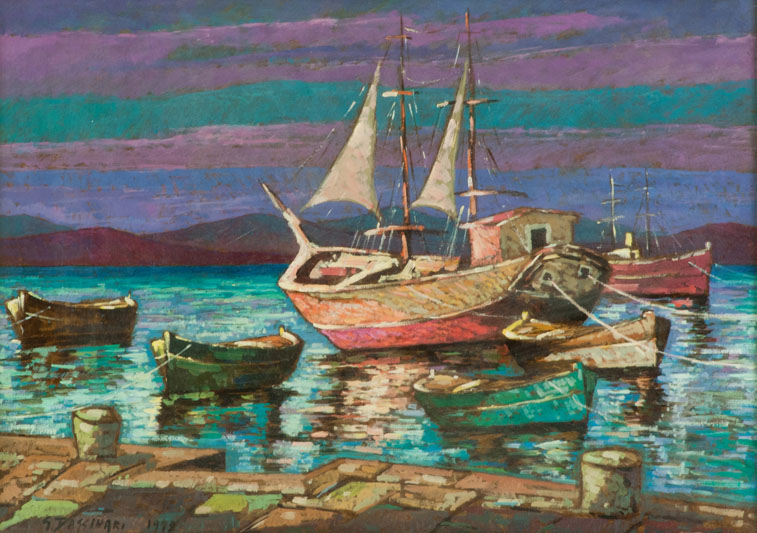 Gino Tassinari Barche ormeggiate, 1979 Olio su tela, cm. 50x70 Leggera craquelure sulla superficie pittorica. Firma e data in basso a sinistra. Sul verso: firma; Etichetta dell'Artista con descrizione e firma.