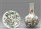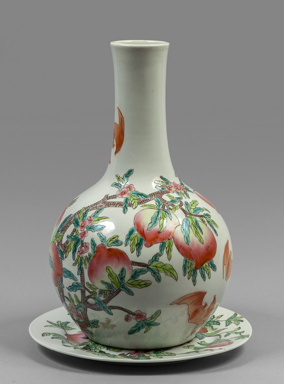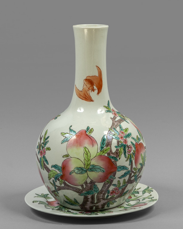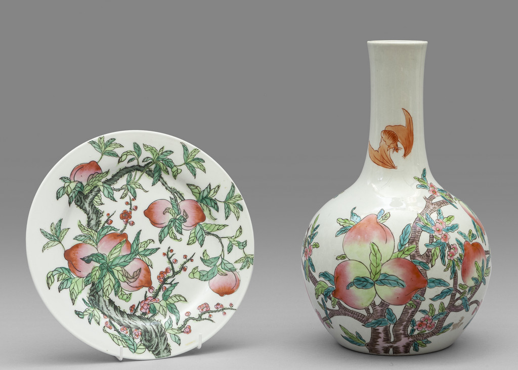 Vaso e piatto in porcellana decorato in policromia con pesche su fondo bianco Cina sec.XX