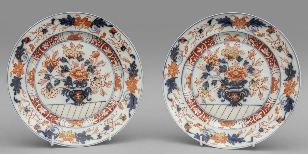 Coppia di piatti in porcellana Imari decorati in policromia Giappone sec.XVIII