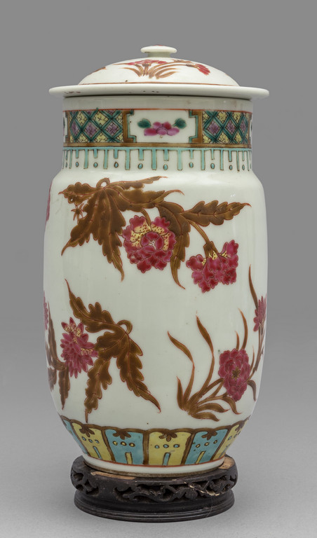 Vaso con coperchio in porcellana di Cina decorazione policroma a fiori su fondo bianco sec.XIX