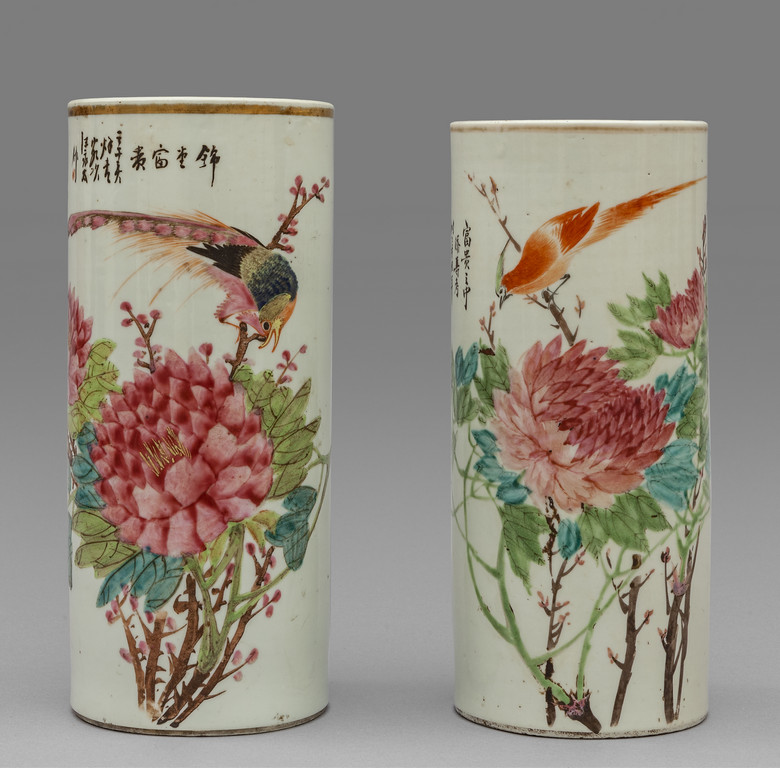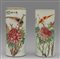 Due vasi a cilindro in porcellana di Cina decorati in policromia con fiori e uccelli su fondo bianco sec.XIX
