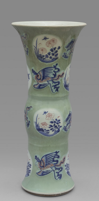 Vaso in porcellana di Cina con decoro a dragoni e fiori su fondo verde marcato sul fondo con il simbolo di una foglia Cina sec.XIX