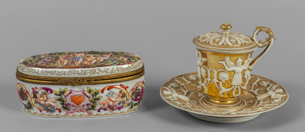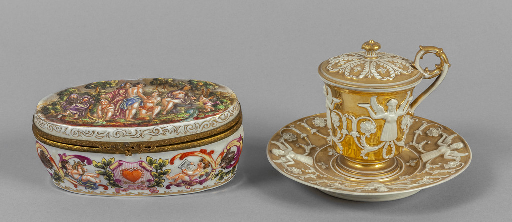 Scatola ovale in porcellana di Capodimonte a figure policrome in rilievo e tazza in porcellana con figure a rilievo in bianco su fondo oro