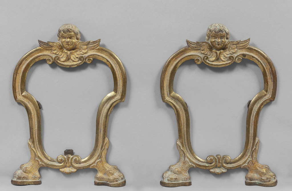 Coppia di cantaglorie in bronzo dorato parte superiore con testina d'angelo piede a zoccolo di animale Napoli sec.XVIII