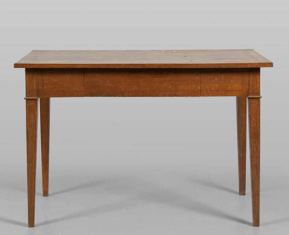Tavolo direttorio in massello di noce filettato in bois de rose e acero gambe troncopiramidali Genova I metà sec.XIX
