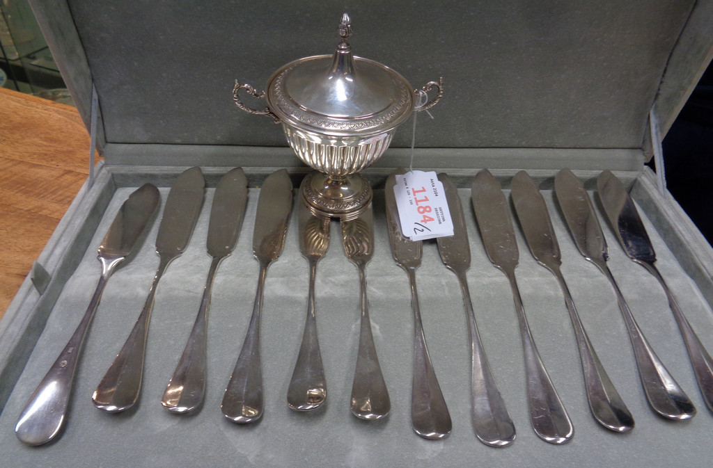 Servizio di posate da pesce per 12 persone e zuccheriera in argento