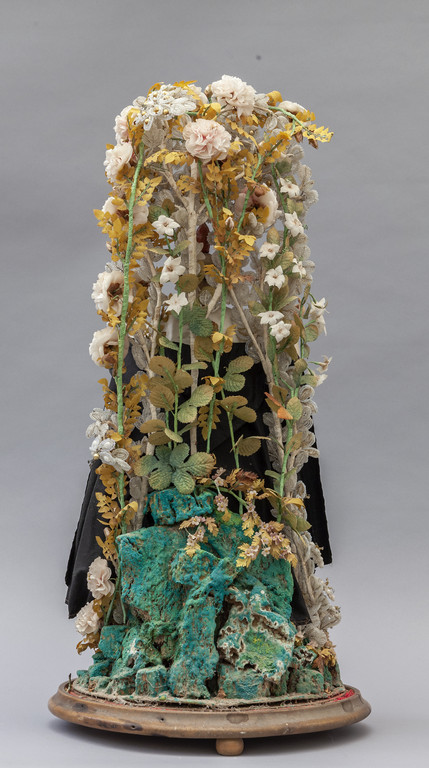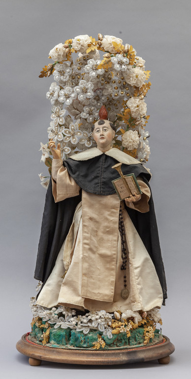 Santo domenicano scultura in terracotta policroma con ricca decorazione di fiori in perline di vetro sec.XIX dentro campana di vetro