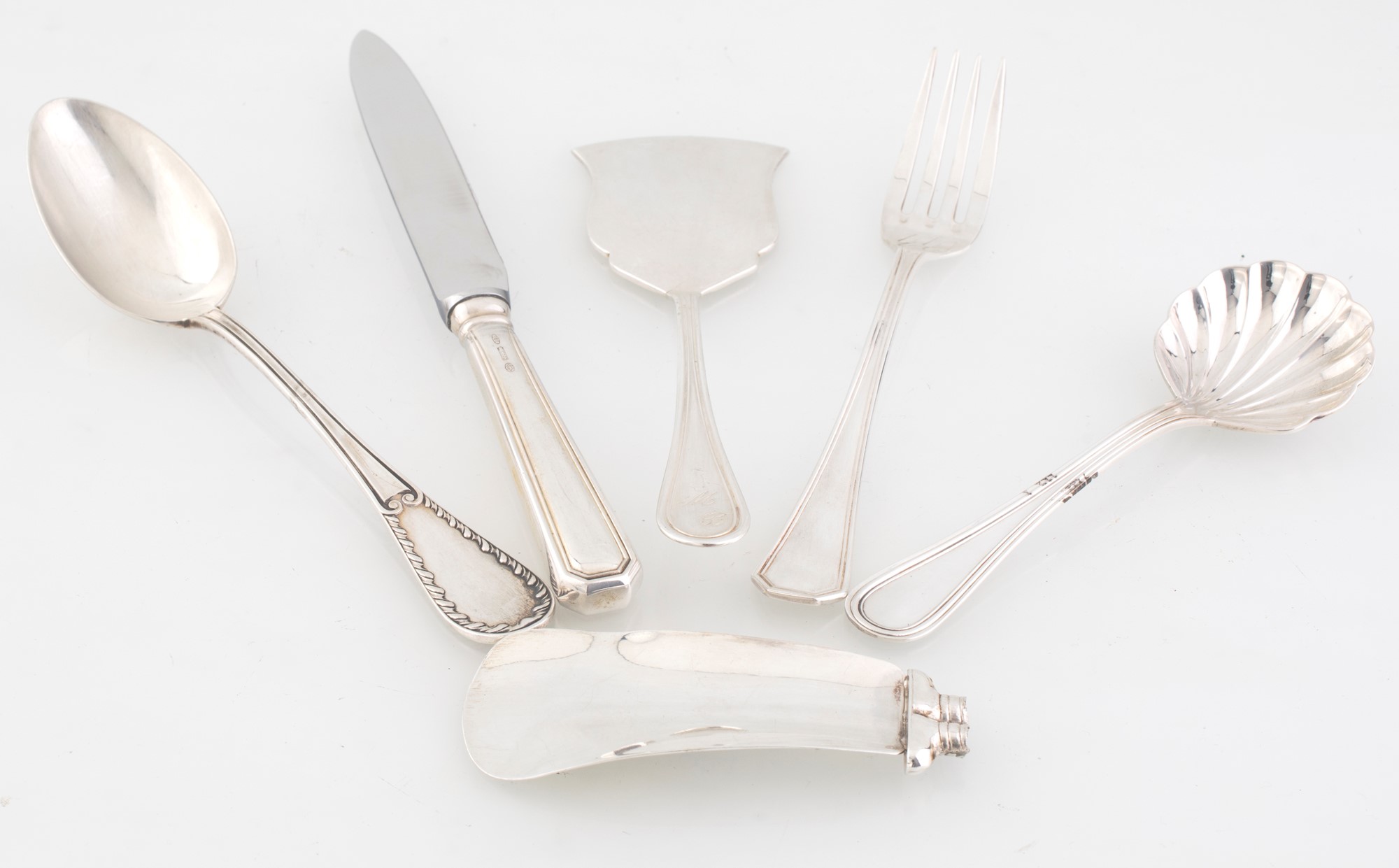 Lotto composto da cinque posate diverse in argento e un accessorio coltello e forchetta da frutta (o da bebè), un cucchiaio da pappa, uno da tè, un coltellino da formaggio con iniziali MB incise ed un calzascarpe privo di manico , peso complessivo gr. 196
