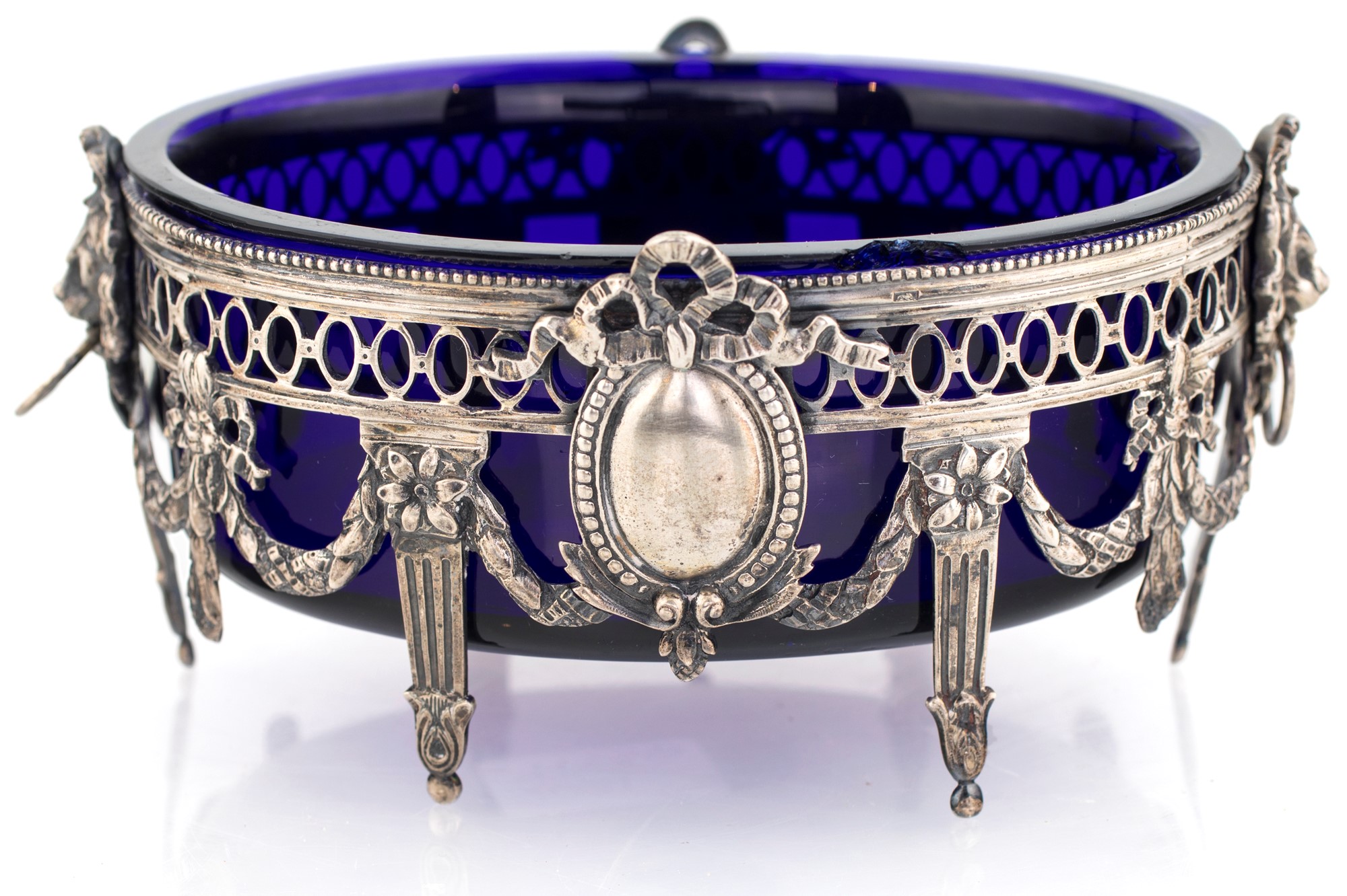 Vaschetta in argento di forma ovale traforata sostenuta da erme scanalate riunite da ghirlande fiorite. Vaschetta in vetro blu. Lieve sbreccatura lungo il bordo, 6x13x9,5
