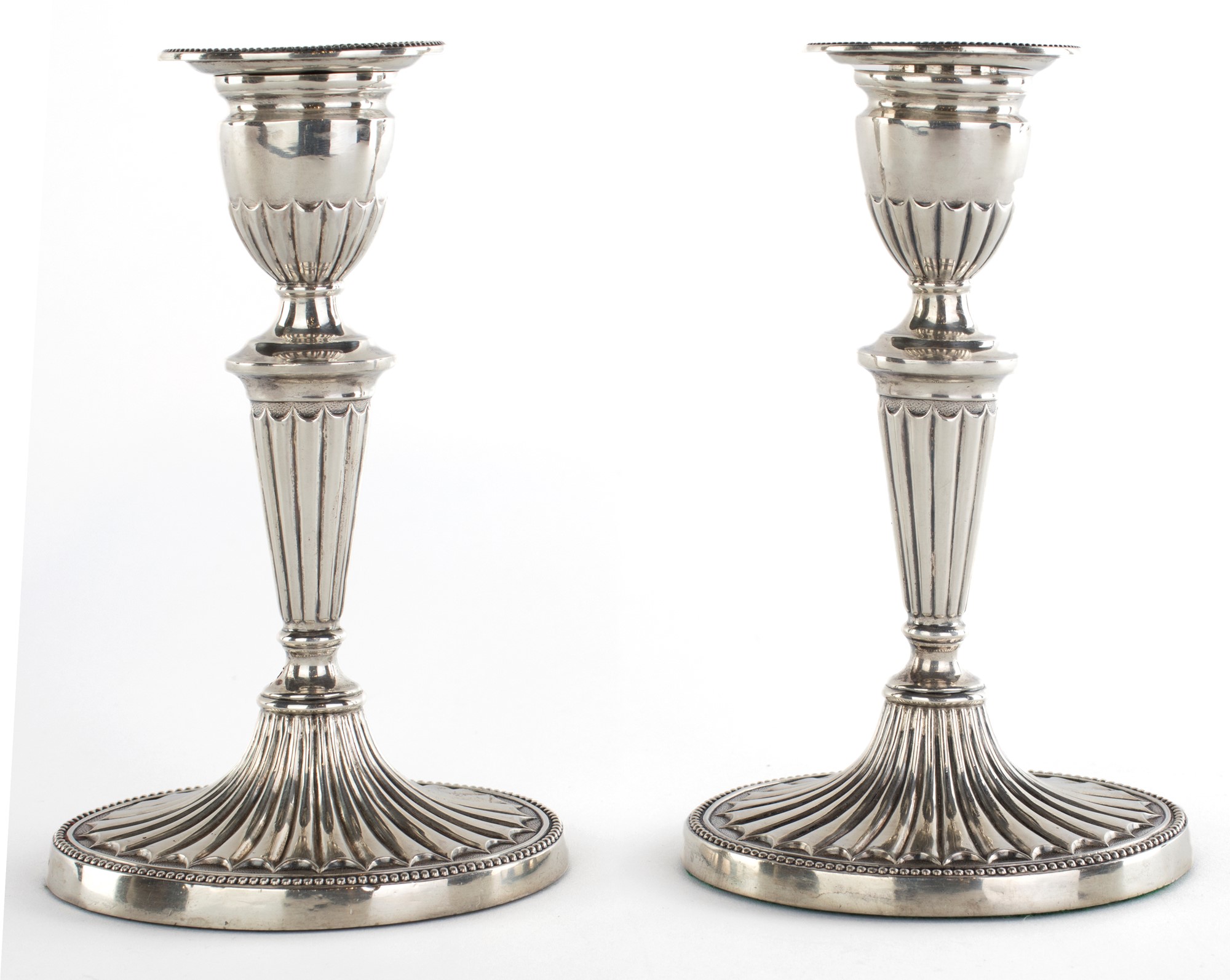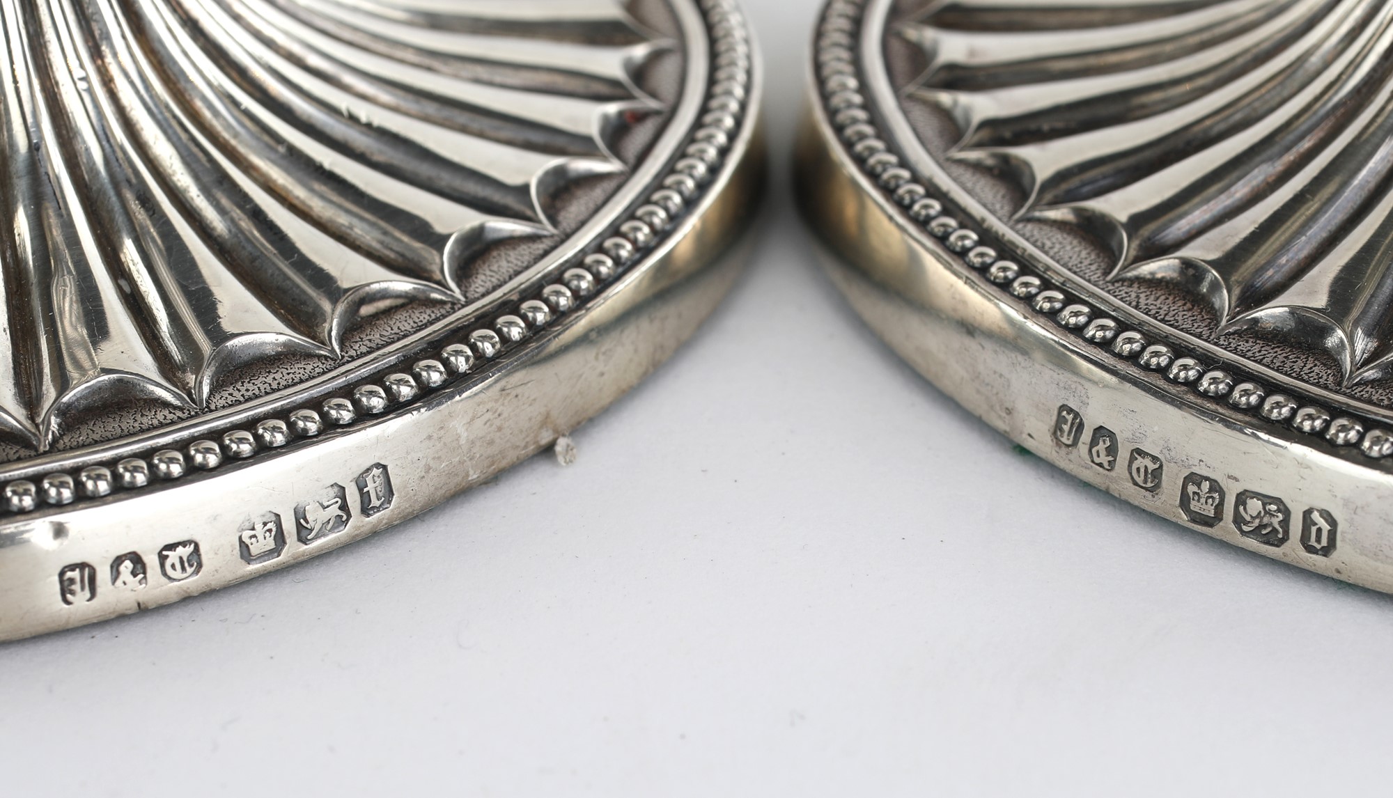 Coppia di piccoli candelieri da tavolo in argento, Inghilterra con piede ovale ornato da baccellature piane disposte a raggiera, racchiuso da profilo perlinato, altezza cm 16,5 - appesantiti