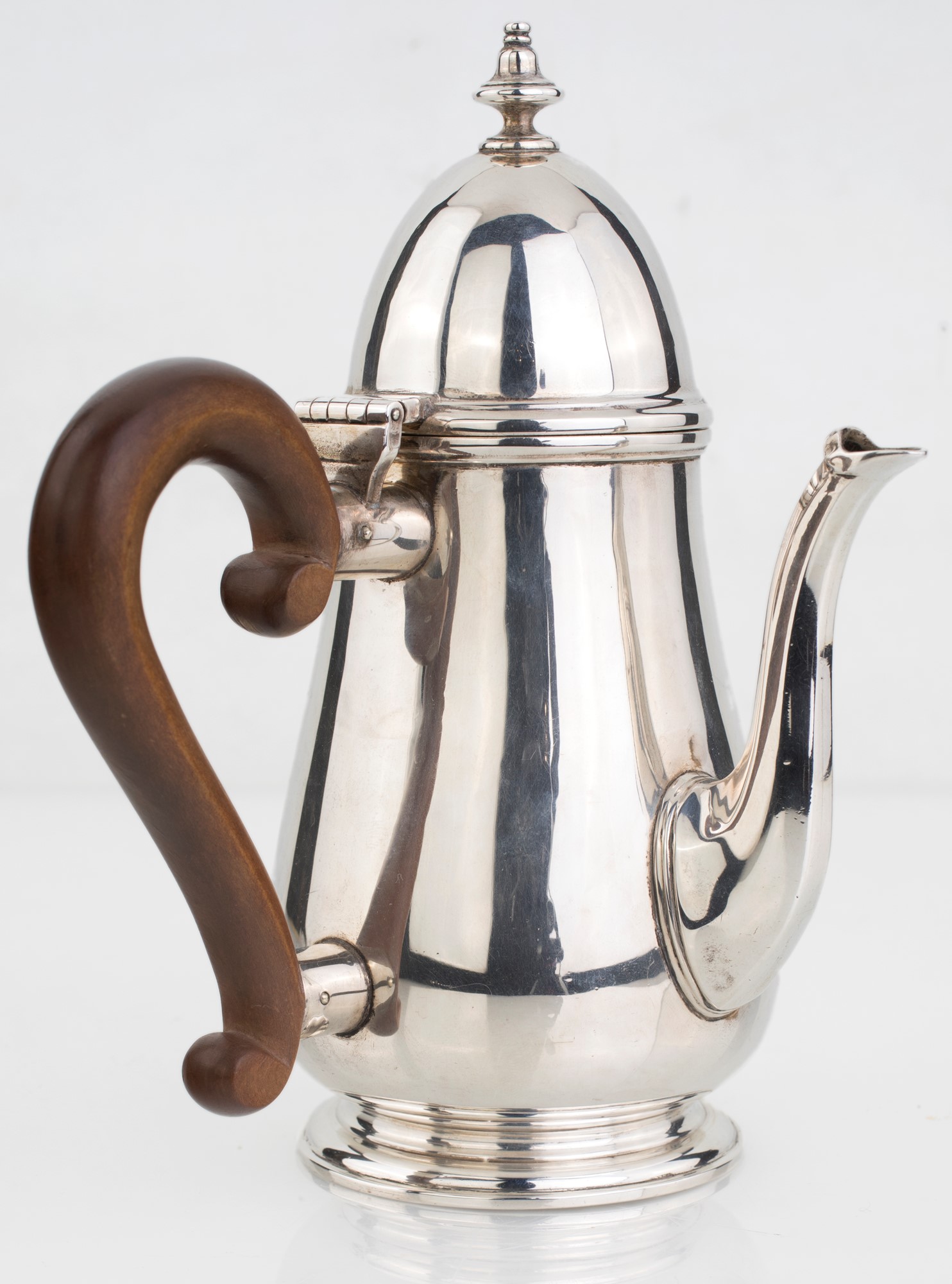 Caffettiera in argento 925/1000, Londra, 1924 con versatoio sagomato e manico in legno posto a sinistra, coperchio a cupolino incernierato sormontato da pinnacolo, altezza cm 18,5 - peso complessivo gr. 358
