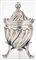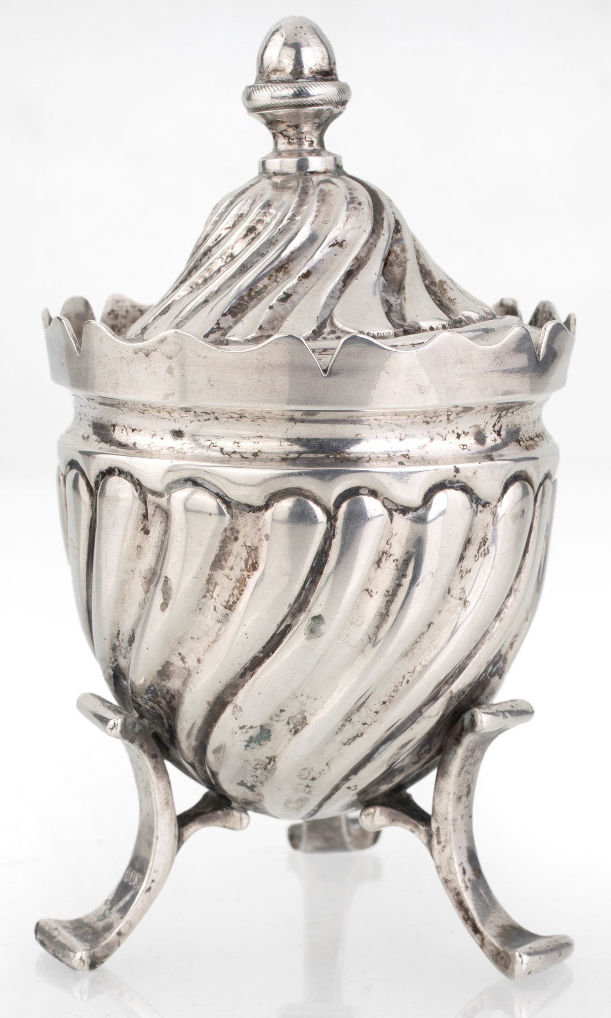 Zuccheriera in argento con corpo a uovo percorso da baccelli elicoidali sorretto da tre piedi; coperchio ad incastro con presa a pigna, racchiuso da bordo emergente con profilo curvilineo, altezza cm 12 - gr. 136