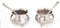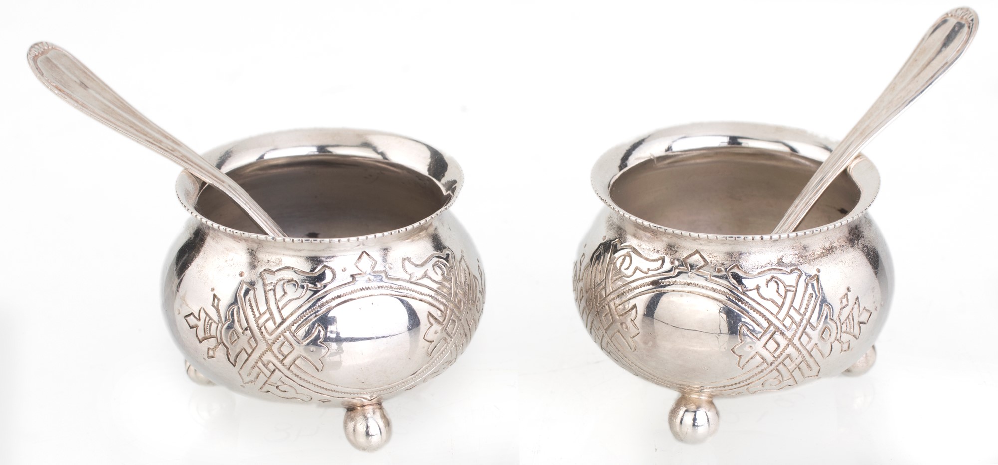 Coppia di piccole saliere da tavola in argento di forma circolare su tre piedini a sfera; provviste di cucchiaino, 3,5x4 - gr. 68
