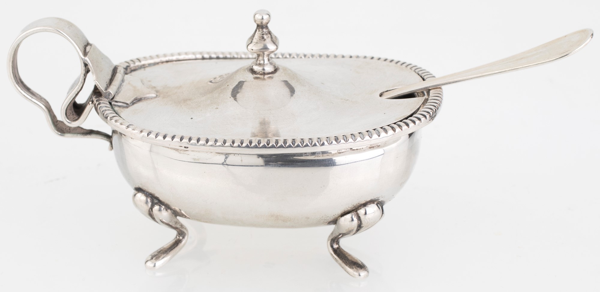 Piccola formaggiera in argento di forma ovale su piedi arcuati e coperchio incernierato sottolineato da perline con presa a pinnacolo; manico a nastro, vaschetta in vetro e cucchiaio, 6x11x6,5; cucchiaino cm 11 - gr. 144