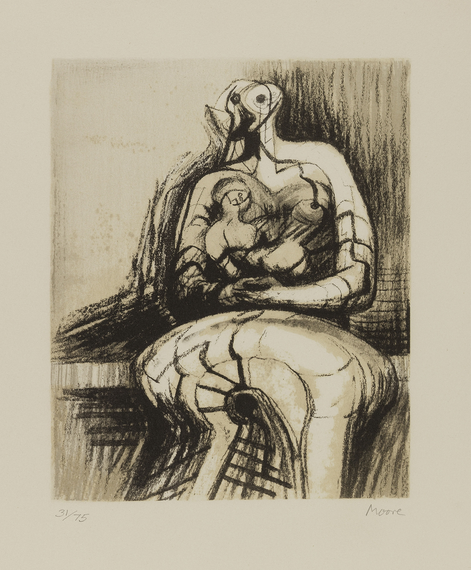 Henry Moore, Castleford 1898 - Much Hadham 1986, Seated Mother and Child, 1976, Litografia a sei colori, es. 31/75, cm. 26x21,6 (lastra), cm. 50,2x40 (carta), Firma a matita sul margine in basso a destra: Moore, tiratura in basso a sinistra: 31/75., Tiratura di 75 esemplari in numeri arabi, 10 in numeri romani e 20 HC., Bibliografia: Patrick Cramer, Alistair Grant, David Mitchinson, Henry Moore, Catalogue of Graphic Work, volume III 1976-1979, Patrick Cramer, Ginevra, 1980, n. 437.
