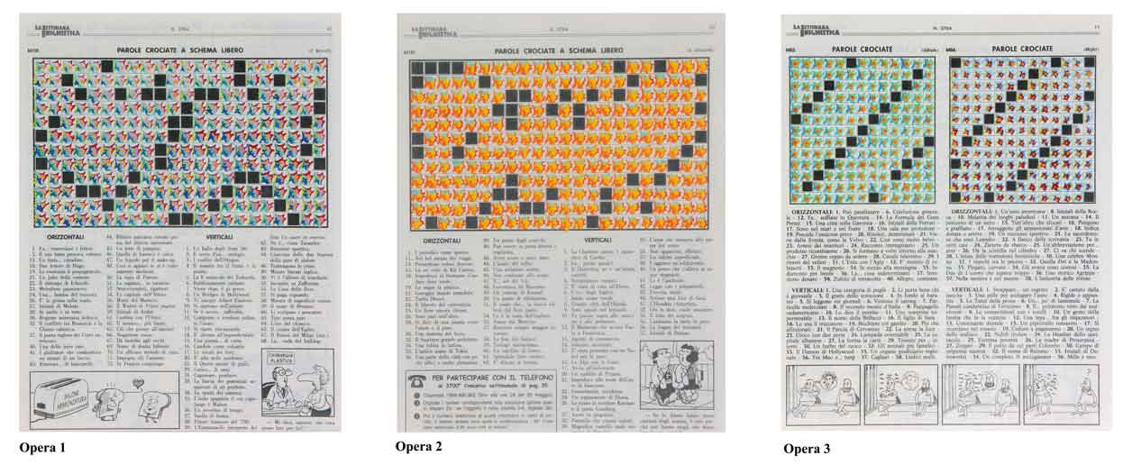 GUSMAROLI Riccardo Verona 1963 Cruciverba, 2004 Tecnica mista su carta cm 24 X 19 Autentiche dell’Archivio Gusmaroli su fotografia, con n° RIGU-712, RIGU-713, RIGU-714 Lotto composto da 3 opere Firma, data ‘Gusmaroli 2004’ (al retro)