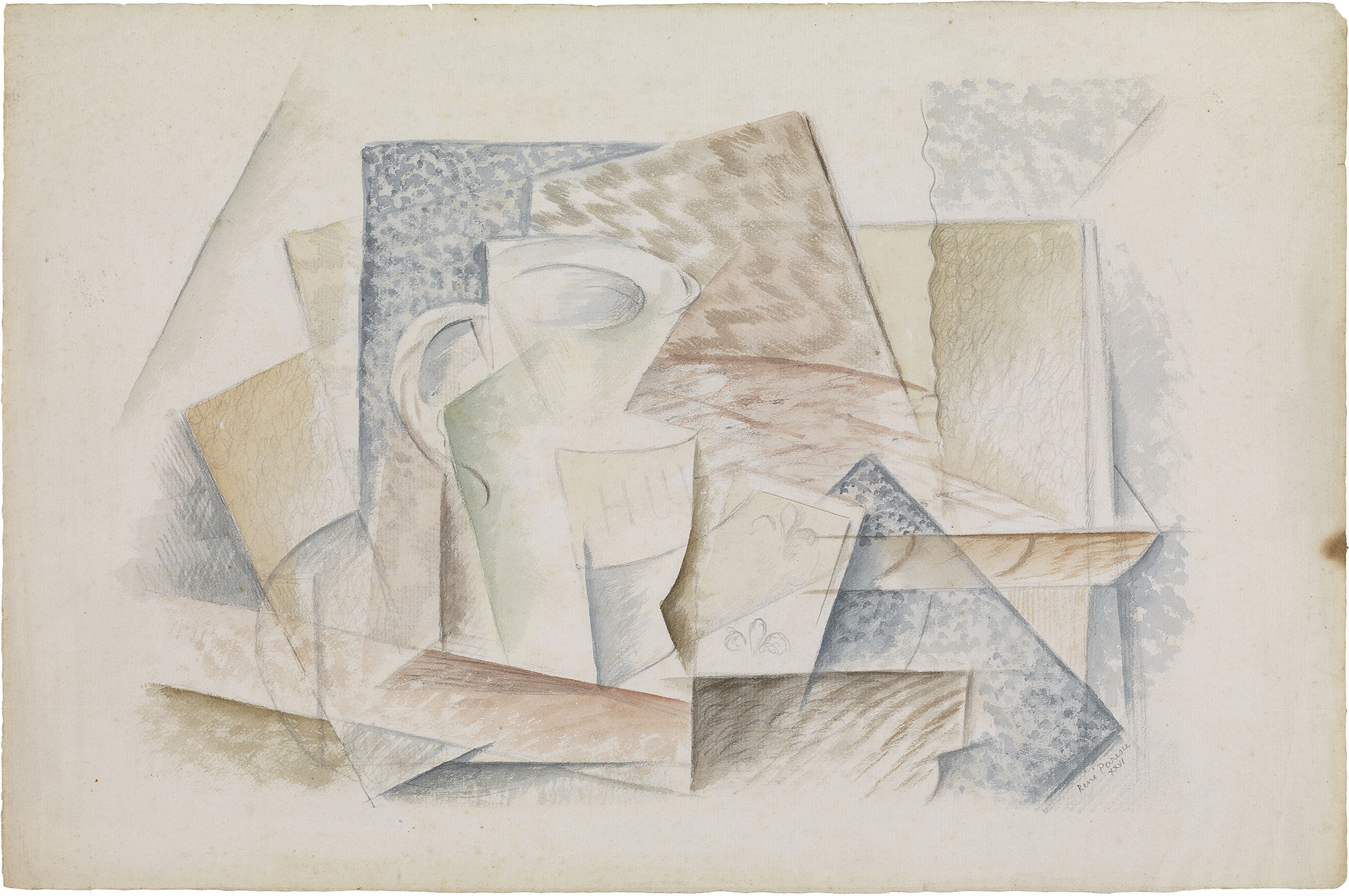 René Paresce, Carouge 1886 - Parigi 1937, Natura morta, 1926, Tecnica mista su carta, cm. 31,7x47,8, , Firma e data in basso a destra: René Paresce XXVI., , Storia, Collezione privata, Londra;, Collezione privata, , Esposizioni, René Paresce e les Italiens de Paris, a cura di Sergio Troisi e Stefano De Rosa, Marsala, Convento del Carmine, 10 luglio - 17 ottobre 2004, cat. n. 16, illustrata a colori;, René Paresce, opere dal 1905 al 1932, testi di Rachele Ferrario, in collaborazione con l'Archivio Paresce, Cortina d'Ampezzo, Galleria d'Arte Frediano Farsetti, 26 febbraio - 3 aprile, poi Milano, Farsettiarte, 6 aprile - 3 maggio 2005, cat. pp. 52, 53, n. 14, illustrata a colori., , Bibliografia, Rachele Ferrario, René Paresce. Catalogo ragionato delle opere, Skira editore, Milano, 2012, p. 248, n. 9/26/C.