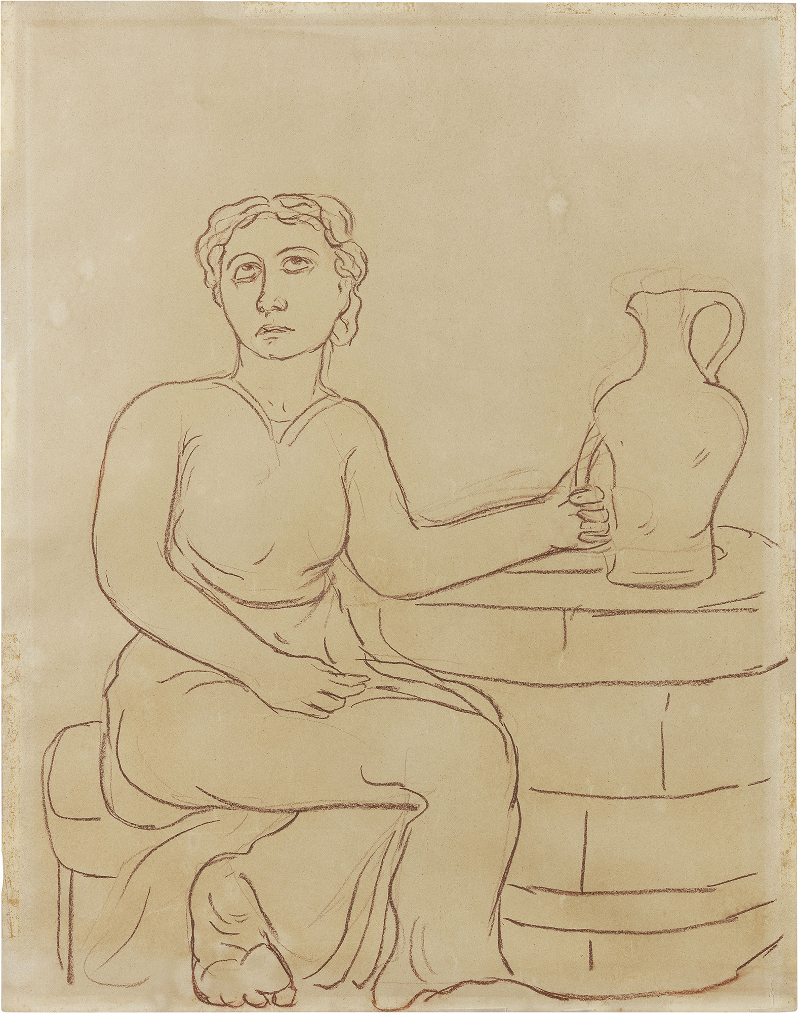 Tullio Garbari, Pergine (TN) 1892 - Parigi 1931, Samaritana al pozzo, 1931, Sanguigna su carta, cm. 56x44, , Firma e data al verso: Tullio Garbari / 1931; su un cartone di supporto: etichetta Galleria San Fedele / Milano / "Garbari sacro" 5/2-14/3 1980: etichetta Tullio Garbari / Mostra commemorativa / Roma - Palazzo delle Esposizioni Giugno - Luglio 1971 / Trento - Palazzo Pretorio Settembre - Ottobre 1971 / Opera fuori catalogo.