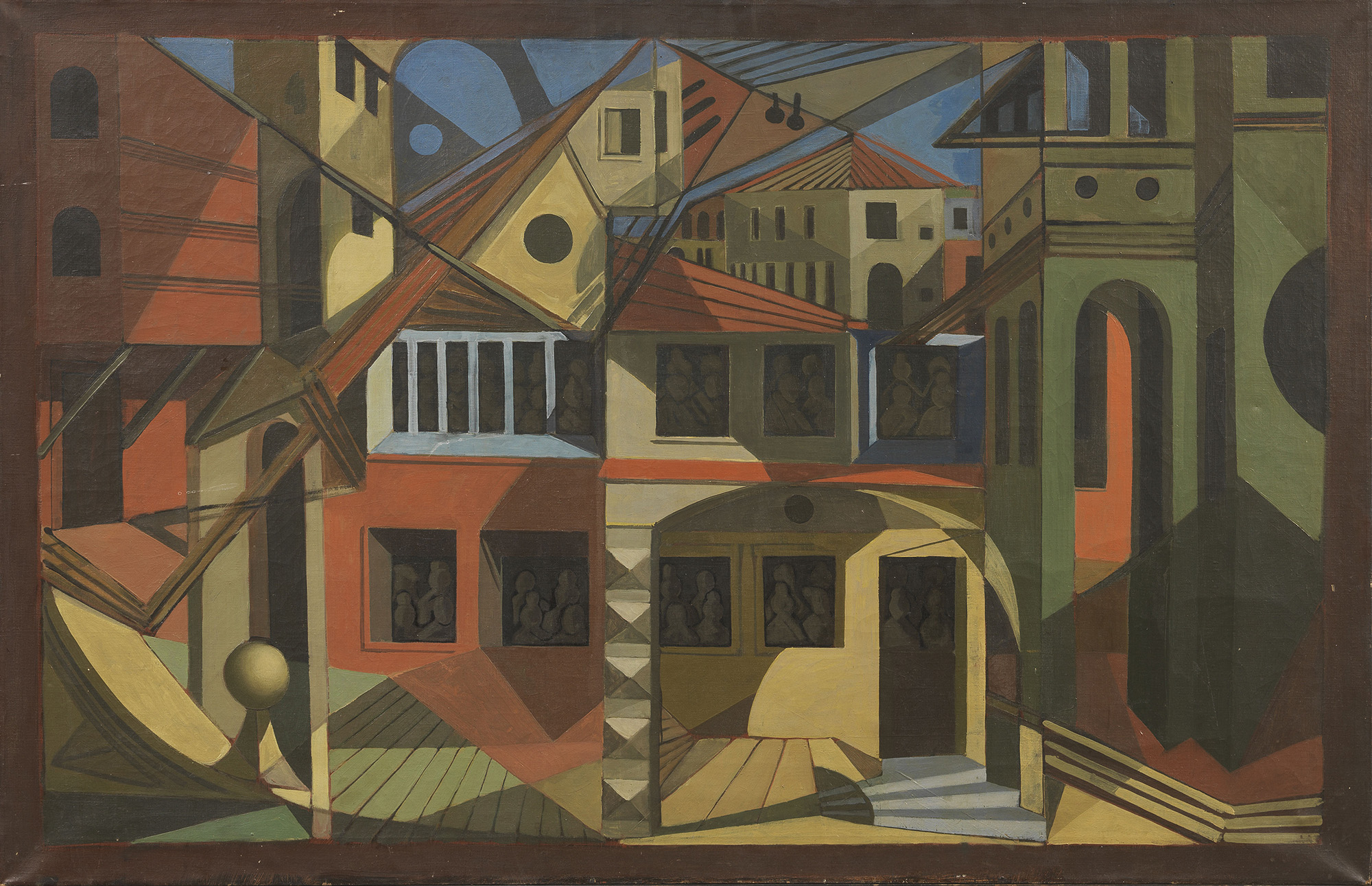 Corrado Cagli, Ancona 1910 - Roma 1976, Scenografia per «Il Trionfo di Bacco e Arianna», (1948), Olio su tela, cm. 79x122, , Firma al verso sulla tela: Cagli: due timbri United [...] Artists, di cui uno con n. 3; firma sul telaio: Cagli: due timbri United [...] Artists: timbro 31 The Little Gallery, East Newark., , Il disegno preparatorio dell'opera è pubblicato in Cagli. La pittura e il teatro, Editori Riuniti, Roma, 1975, p. 37, n. 36.