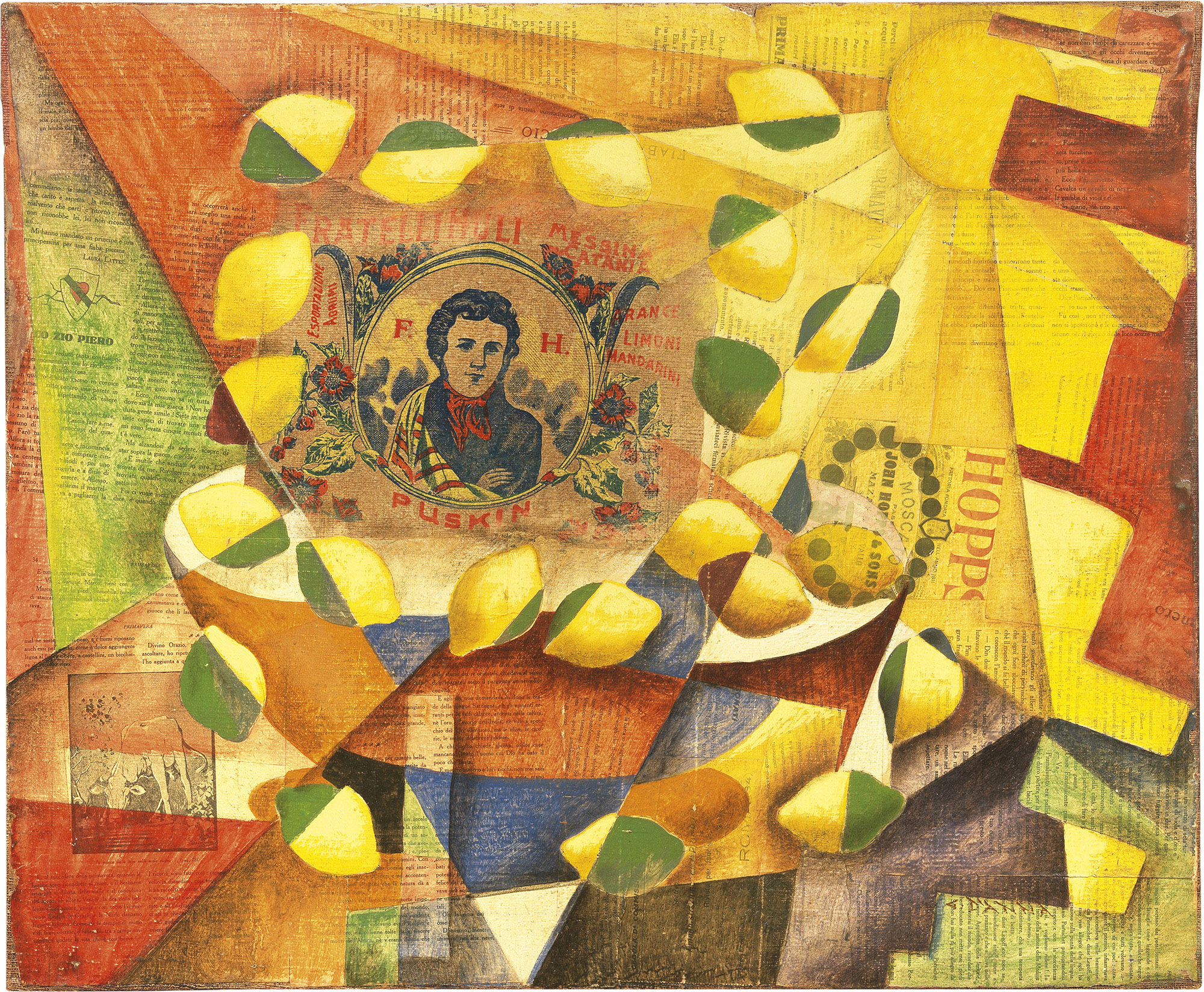 Giulio D'Anna, Villarosa (En) 1908 - Messina 1978, Composizione futurista - Limoni, 1931 ca., Olio e collage su tela, cm. 62x74, , Firma in basso a destra: G. D'Anna. Al verso sul telaio: etichetta Arte Centro, Milano, con dati dell'opera e n. 9827., , Certificato su foto Archivio Storico dei Futuristi Siciliani., , Esposizioni, Un mondo fantastico - Giulio D'Anna & Sibò, a cura di Flavio Lattuada, Anna Maria Ruta e Giancarlo Carpi, Milano, Galleria Artecentro, 10 ottobre - 30 novembre 2019, cat. p. 64, illustrato a colori.