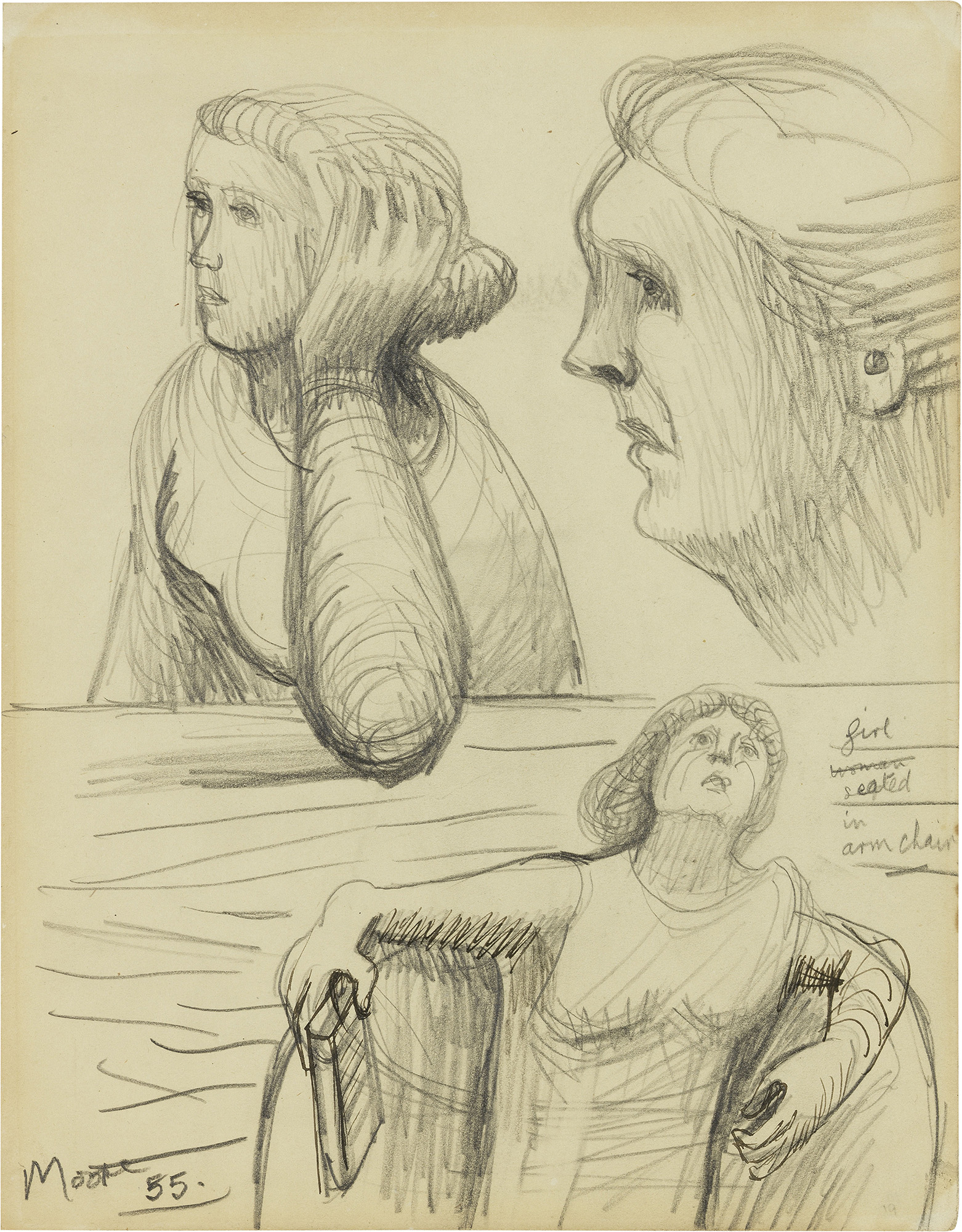 Henry Moore, Castleford 1898 - Much Hadham 1986, Girl Seated in Armchair, 1955, Matita e inchiostro su carta, cm. 22,4x17,4, , Firma e data in basso a sinistra: Moore 55, titolo a destra verso il basso: Girl seated in armchair., , Opera registrata presso la Henry Moore Foundation al n. HMF 2758., , Bibliografia, Ann Garrould, Henry Moore. Complete Drawings 1950-76, vol. IV, Much Hadham, 2003, p. 92, n. AG 55-56.9.