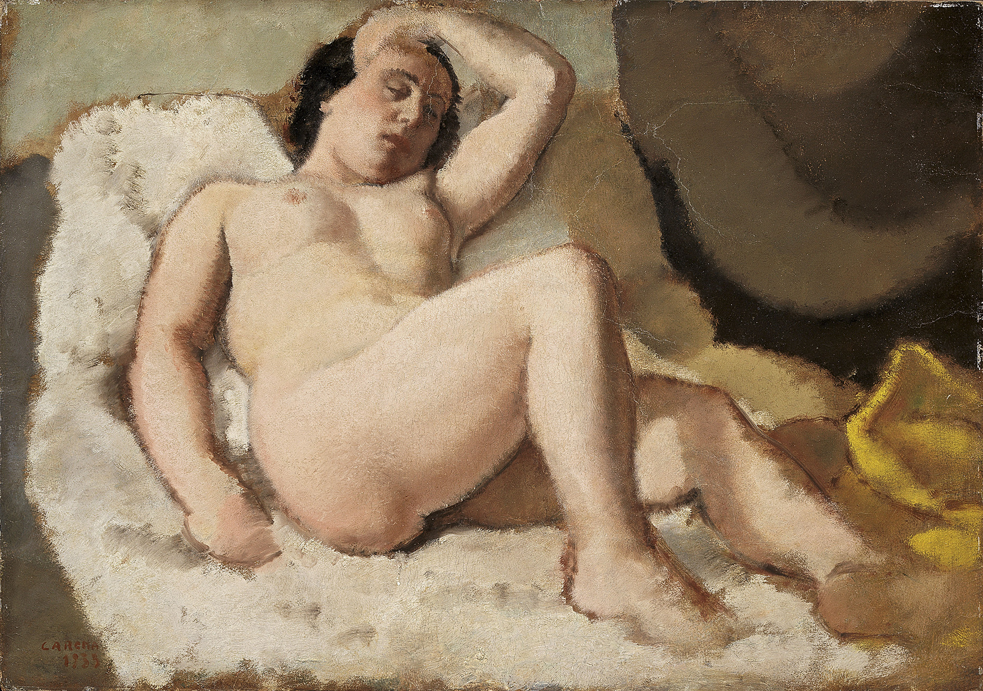 Felice Carena, Cumiana (To) 1879 - Venezia 1966, Nudo, 1933, Olio su cartone applicato su tavola, cm. 70,5x100,5, , Firma e data in basso a sinistra: Carena / 1933. Al verso sulla tavola: due timbri F.lli Orler, Favaro Veneto., , Certificato su foto F.lli Orler, Favaro Veneto, con n. 16., , Esposizioni, Omaggio a Felice Carena, Padova, Galleria d'Arte Anteriore, 29 novembre - 12 dicembre 1969, cat. p. n.n., illustrato.
