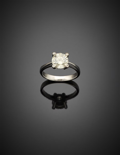 Anello in oro bianco con diamante rotondo taglio a brillante di ct. 2,35 circa rifinito con quattro piccoli diamanti nelle griffe, g 5,40 circa misura 20/60.