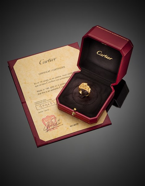 Anello "Panthère" in oro giallo, g 12,73 circa misura 10/50. Firmato Cartier in corsivo, n° G04683. Con scatola e Garanzia originali