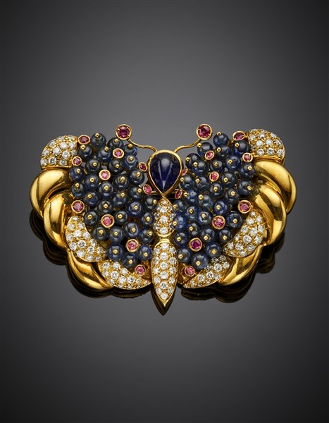 Cabochon sapphire, diamond and ruby yellow gold butterfly brooch, white gold details, diamonds in all ct. 1.80 circa g 45.63 circa, width cm 6.20 circa. Signed and marked Sabbadini, 963 MI.