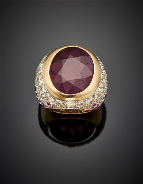 Anello in oro giallo e bianco con diamanti per complessivi ct. 4,70 circa e rubini per complessivi ct. 0,80 circa, al centro un grande corindone ovale, g 44,70 circa misura 17/57. (lievi difetti)