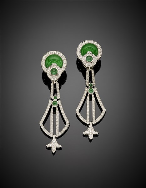 White gold diamond pendant earrings accented with green hyaline quartz cabochon composite stones, diamonds in all ct. 1.70 circa, g 30.52 circa, length cm 7.30 circa. Signed Angelo Spinelli, 2885 AL.