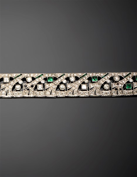 Bracciale in platino con diamanti old mine, rotondi e carrè per complessivi ct. 3,80 circa, rifinito con smeraldi calibré, g 37,10 circa, lungh. cm 18,20 circa. (difetti e mancanze)