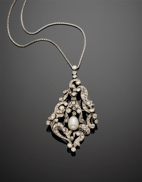 Broche/pendente a volute in oro bianco rifinito con diamanti per complessivi ct. 2 circa e una perla a goccia di mm 10,30x7,40 circa, con catenina di cm 40 circa, g 18,84 circa, lungh. cm 6,50 circa. Catenina marcata 358 MI.