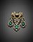 Old mine diamond and emerald bi-coloured gold volute brooch with three pendants, diamonds in all ct. 1.75 circa and emeralds in all ct. 1.80 circa, g 17.98 circa, length cm 4.90 circa.