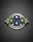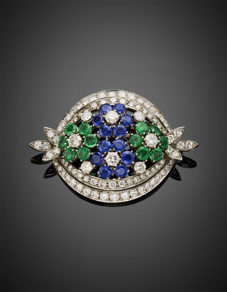 Broche floreale in oro bianco rifinita in diamanti per complessivi ct. 2,60 circa, zaffiri e smeraldi, g 12,86 circa, lungh. cm 4,50 circa. Marcata 577 MI.