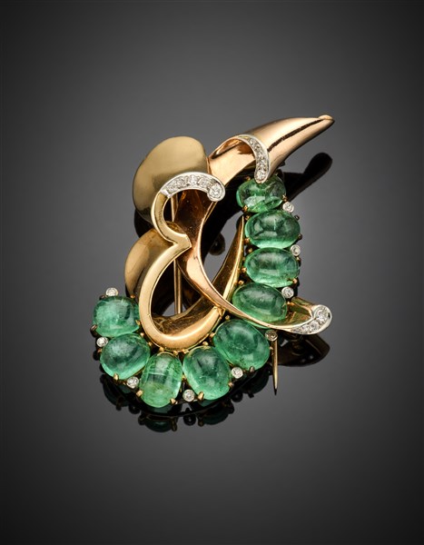 Emerald bead and diamond yellow gold “Reflection” brooch, white gold detail g 20.47 circa, length cm 5.60 circa. Signed Trabert & Hoeffer Mauboussin and with the inscription "designed and executed for Mrs Elinor Cochran".