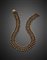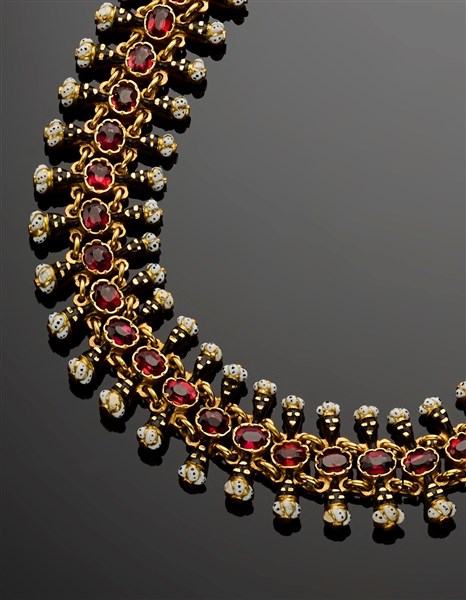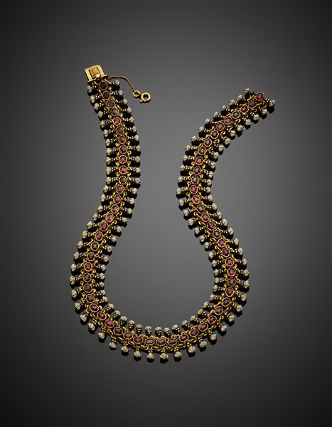 Collier in oro giallo con granati e piccoli mori contrapposti rifiniti in smalti, g 89,54 circa, lungh. cm 38,50 circa. (lievi difetti)