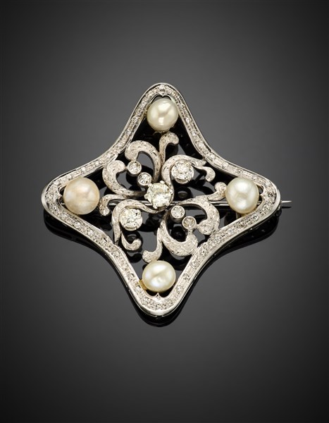 Spilla in oro bianco con diamanti per complessivi ct. 1,55 circa e perle natura