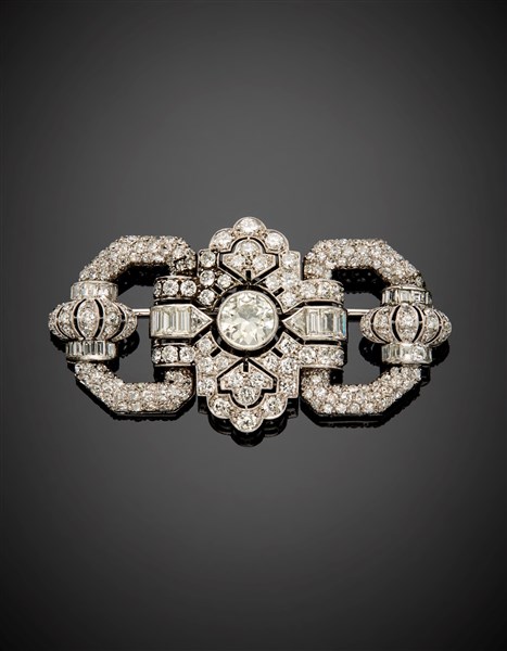 Spilla in platino e oro bianco con diamanti rotondi, baguette e triangolari per