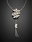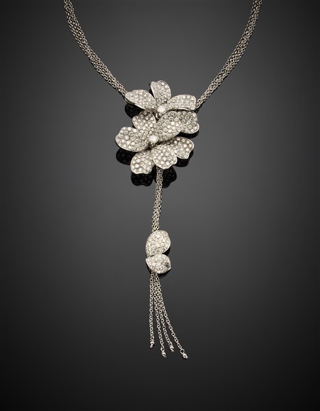 Collier a quattro fili di catenina in oro bianco con centrale a guisa di fiori rifinito in diamanti a tenere una nappa con foglie, diamanti per complessivi ct. 8 circa, g 37,07 circa, lungh. cm 41,50 circa.
