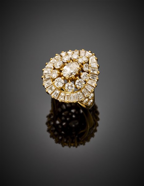 Anello in oro giallo con diamanti rotondi e tapered per complessivi ct. 3,40 circa, al centro un diamante ovale di ct. 0,75 circa, g 10,27 circa misura 12/52.