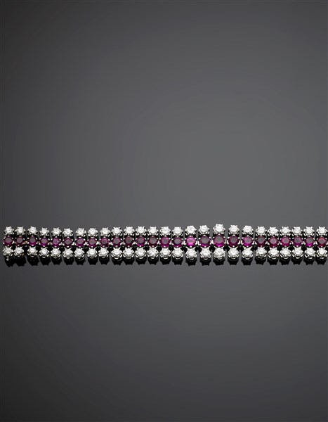 Bracciale modulare leggermente a scalare in oro bianco a due file di diamanti ed una fila di rubini centrale, diamanti per complessivi ct. 13,20 circa e rubini per complessivi ct. 12,10 circa, g 50,30 circa, lungh. cm 18.70 circa. In scatola Chiaravalli.