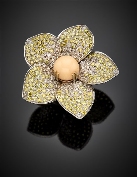 White gold fancy pink and yellow diamond pavé flower ring centering a ct. 7.82 Melo Melo pearl of mm 9.29x10.20 circa, diamonds in all ct. 4.60 circa, g 21.04 circa size 16/56.