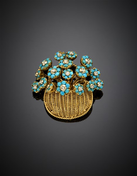 Broche in oro giallo a cestino con fiori en tremblant rifinita con turchesi e diamanti huit-huit, dettagli in oro bianco, g 27,15 circa, largh. cm 4,10 circa. Firmata Tiffany & Co. (mancanze)