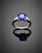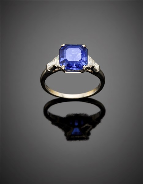 Anello in platino con zaffiro centrale di ct. 4,60 circa e due diamanti ai lati