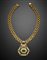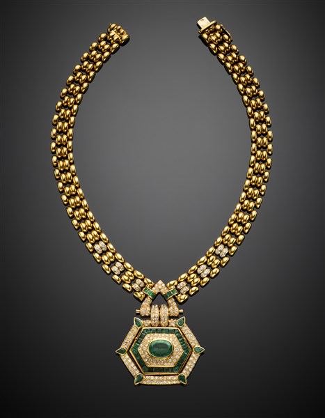 Collier modulare in oro giallo con centrale geometrico in diamanti e smeraldi,
