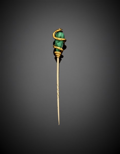 Bi-coloured gold and malachite snake tie pin, g 4.74 circa, length cm 7.20 circa. Signed A.Ravasco.