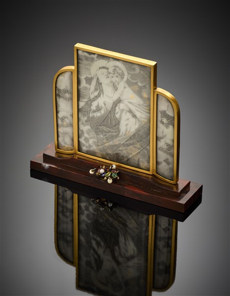 Ornamento da tavolo con incisione in parte dorata di Madonna con Bambino su lamina d'argento incorniciata in metallo dorato con dettagli in gemme e perle su base in diaspro, g 313,60 circa, lungh. cm 11,30, largh. cm 13,50 circa. Firmato A.Ravasco.